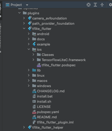 3.자동으로 다운받아지는 TensorFlowLiteC.framework를 프로젝트/ios/.symlinks/plugins/tflite_flutter/ios/이쪽에 넣어준다(Classes폴더가 보이면 잘 찾아온 것이다. 밑의 이미지들을 참고하자)