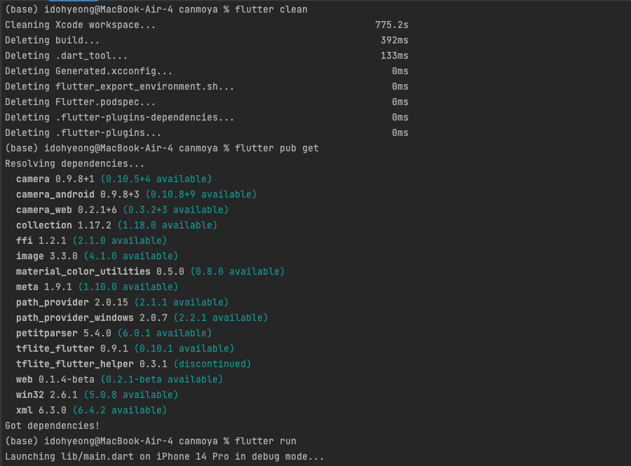 4. 빌드를 처음부터 해주기 위해, flutter clean, flutter pub get, flutter run을 차례대로 수행해주면 끝!