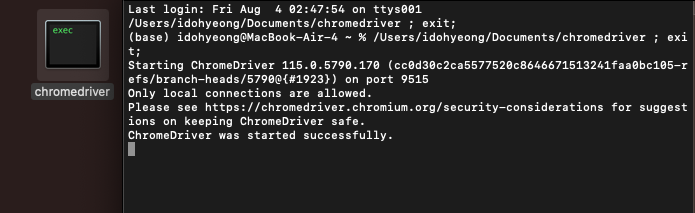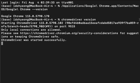 "Chrome의 버전이 115.0.5790.114이고, ChromeDriver의 버전이 114.0.5735.90인 것을 확인했습니다. 이 두 버전은 호환되지 않습니다."