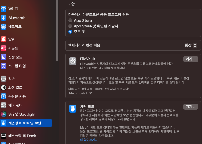 아래처럼 모든 곳의 허용이 되어있고 대부분의 경우라면 OS에서 앱을 신뢰하게 되어 열릴것이다. 하지만 이렇게 해도 안열린다면? 2번으로 ㄱㄱ(내가 그랫다 ㅠ)