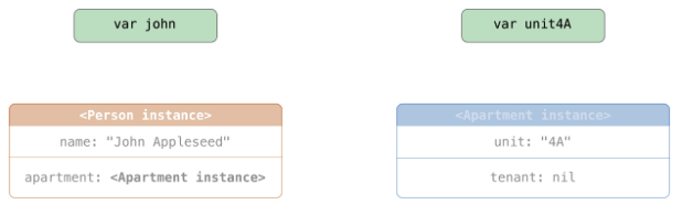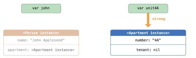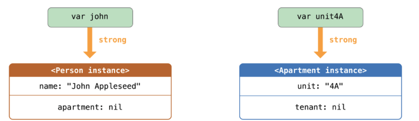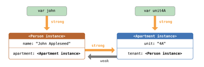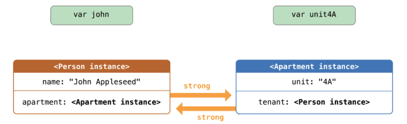 하지만 ARC의 강한 참조방식은 두개의 클래스의 인스턴스(객체)가 서로를 강하게 참조할 때